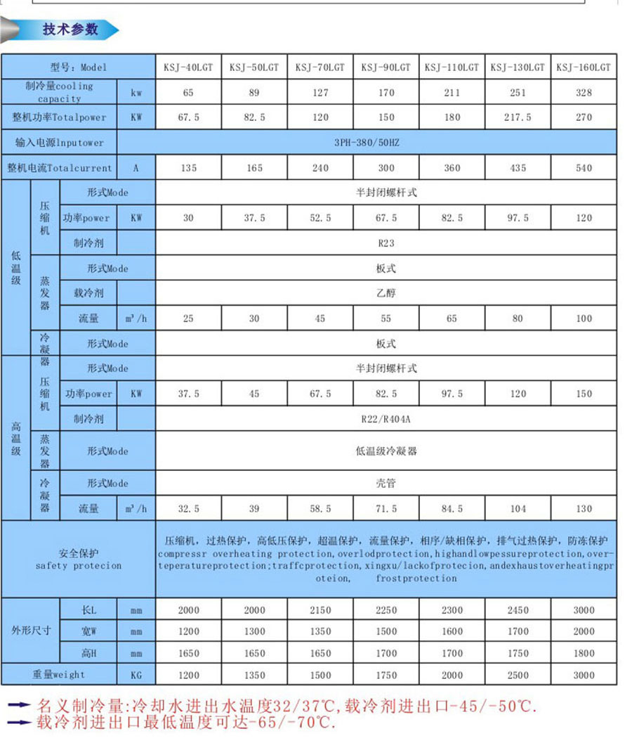 2.三元復(fù)疊低溫冷水機(jī)組:其由高溫級(jí)(R404A/R22)、低溫級(jí)R23、超低溫級(jí)(R14)組合而成,低溫可提供-120℃超低溫工藝?yán)湓础C(jī)組制冷量范圍為3kw~300kw;