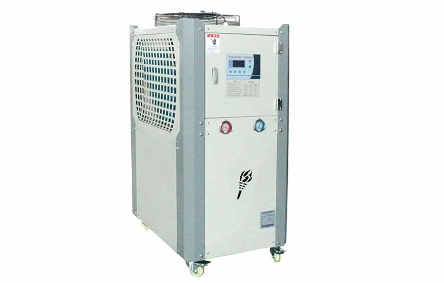 2、風冷式擠塑用冷水機,通過風扇以空氣為冷凝方式的控溫設備,有箱式和螺桿式;